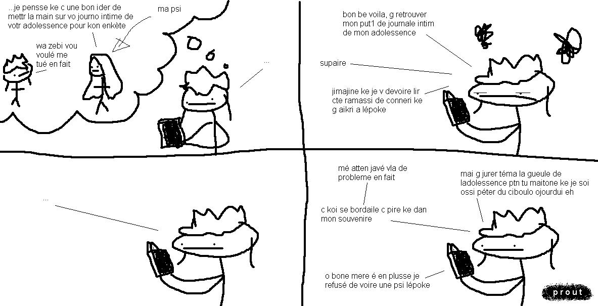 vel se tient seule avec un carnet dans les mains. Elle repense à la fois où sa psy lui disait : « Je pense que c'est une bonne idée de mettre la main sur vos journaux intimes de votre adolescence, pour qu'on enquête »… ce à quoi elle avait répondu : « Wah zebi, vous voulez me tuer en fait ? ».